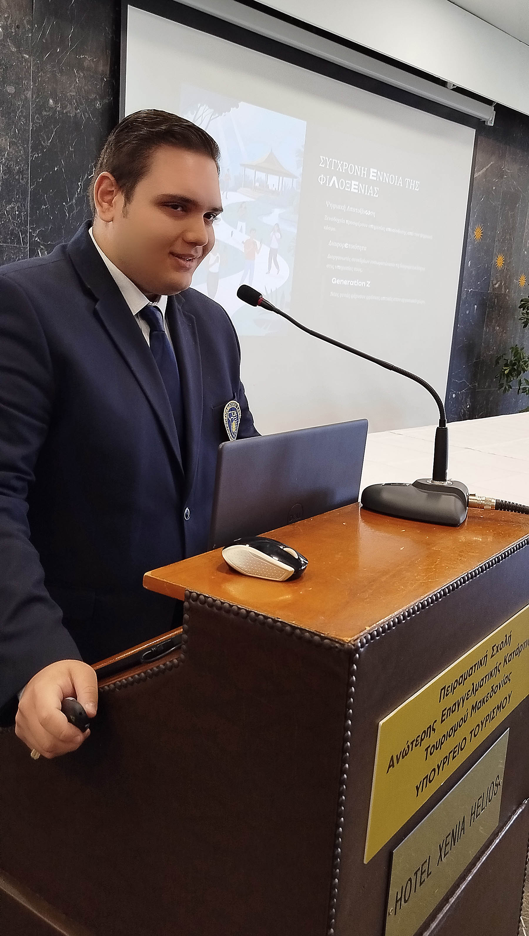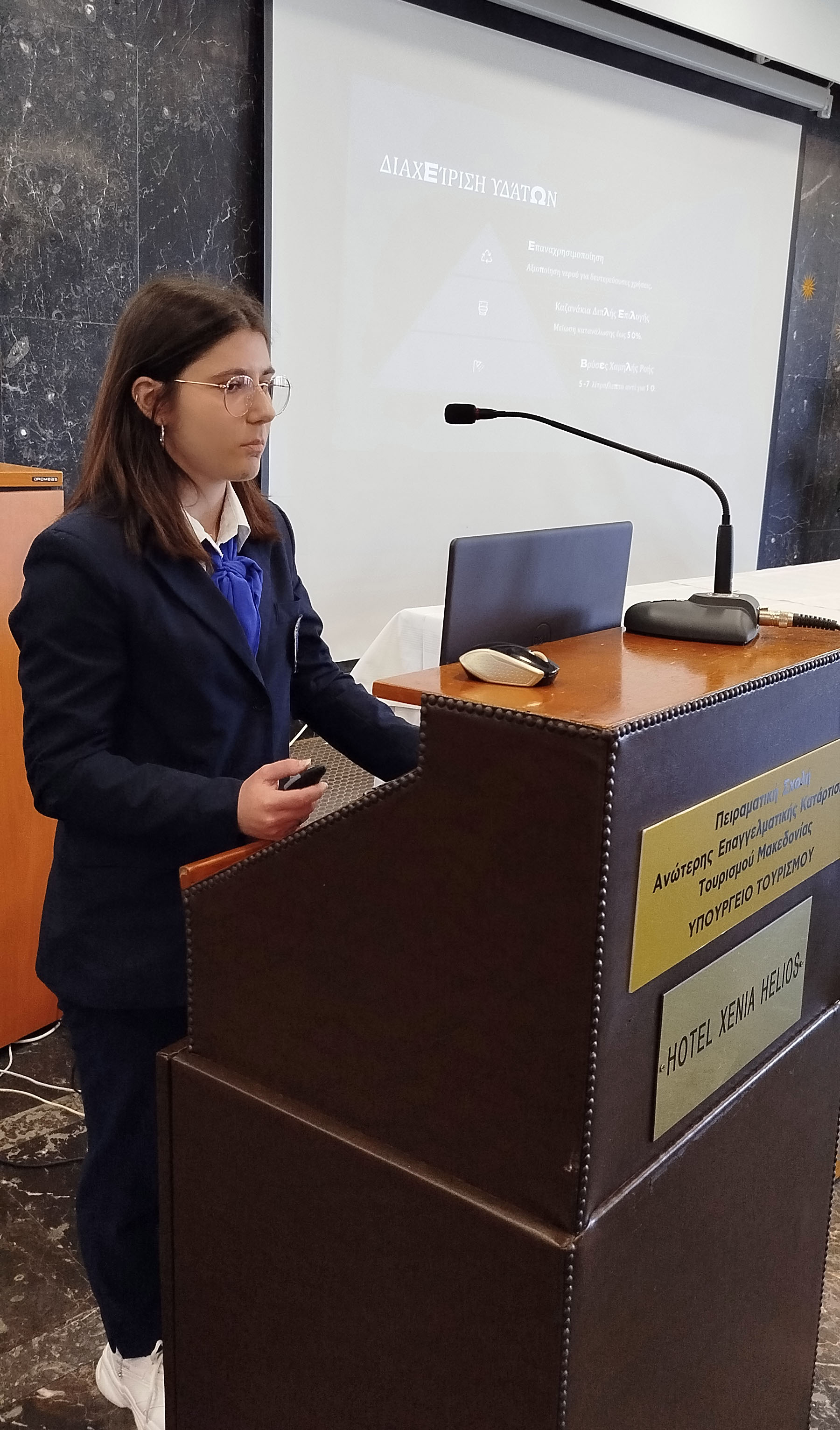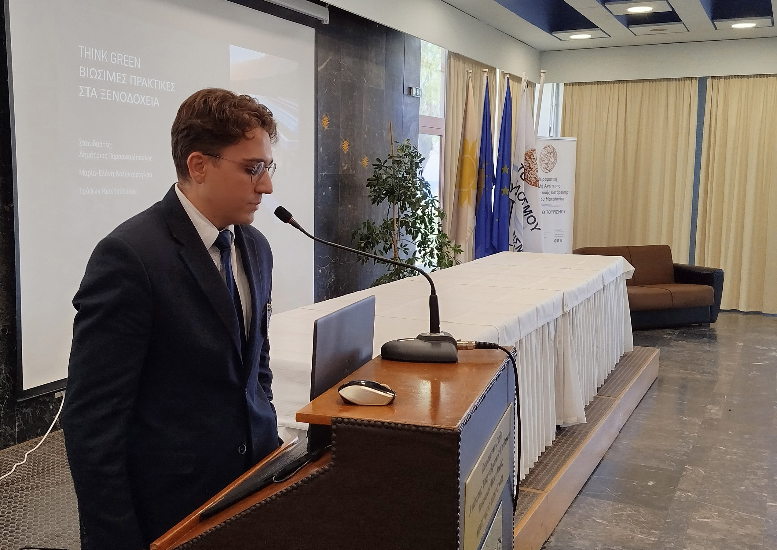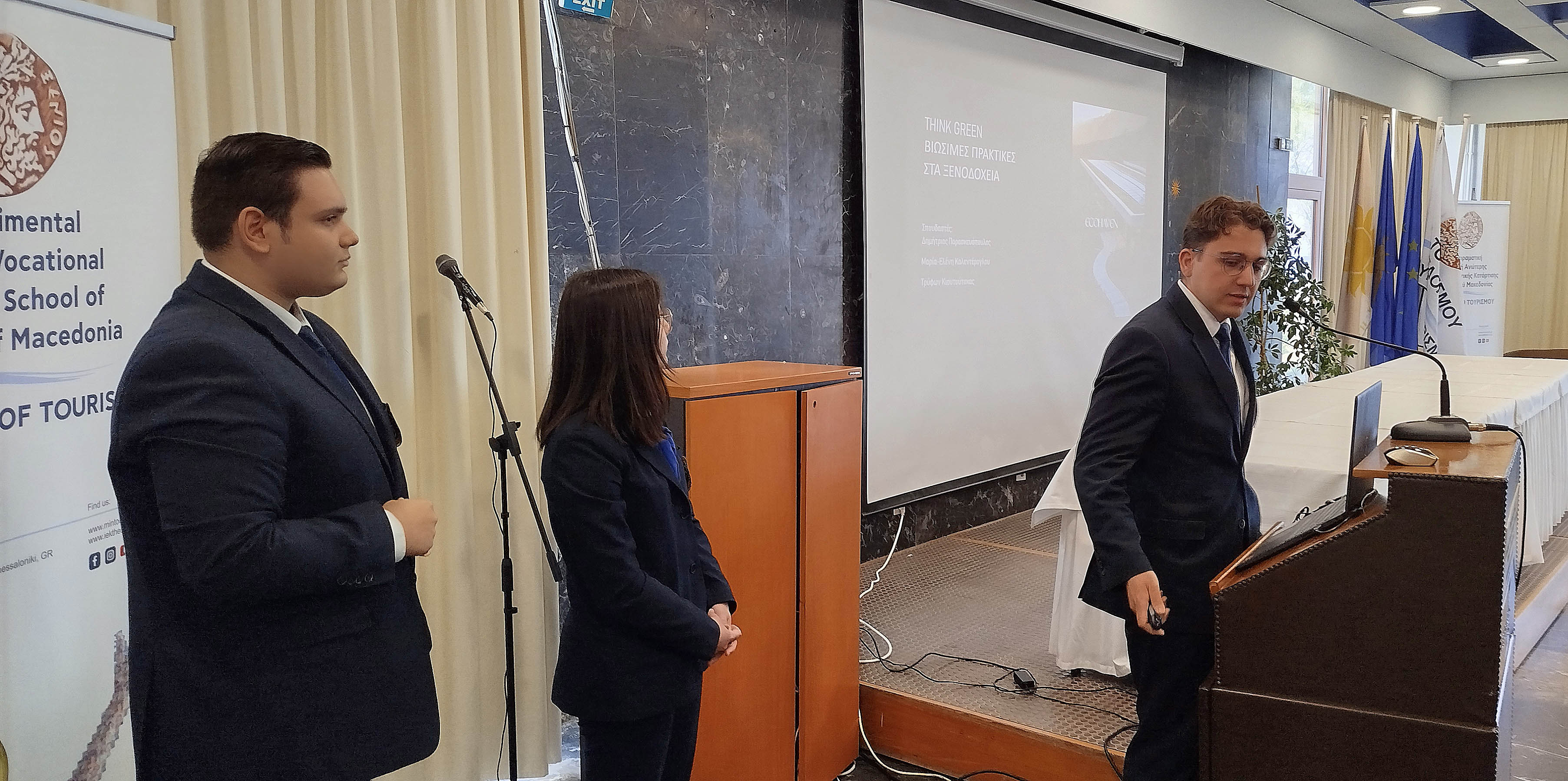 Ιδιαίτερο ενδιαφέρον προκάλεσε η παρουσίαση της εργασίας Think Green από τους σπουδαστές/ στριες της Πειραματικής ειδικότητας «Στέλεχος Επιχειρήσεων Φιλοξενίας με εξειδίκευση στον Τομέα ΔΙΟΙΚΗΣΗΣ δωματίων – Rooms Division Management» Μαρία Ελένη Καλεντέρογλου, Τρύφωνα Κιουτούτσκα και Δημήτρη Παρασκευόπουλο, οι οποίοι ανέδειξαν καλές πρακτικές βιωσιμότητας στις ξενοδοχειακές μονάδες.