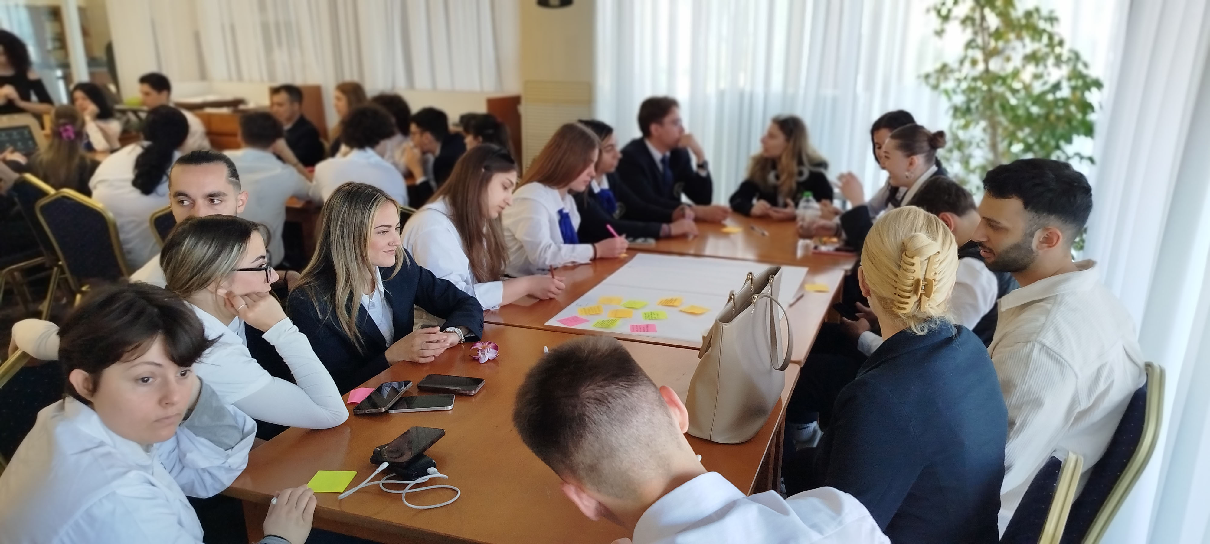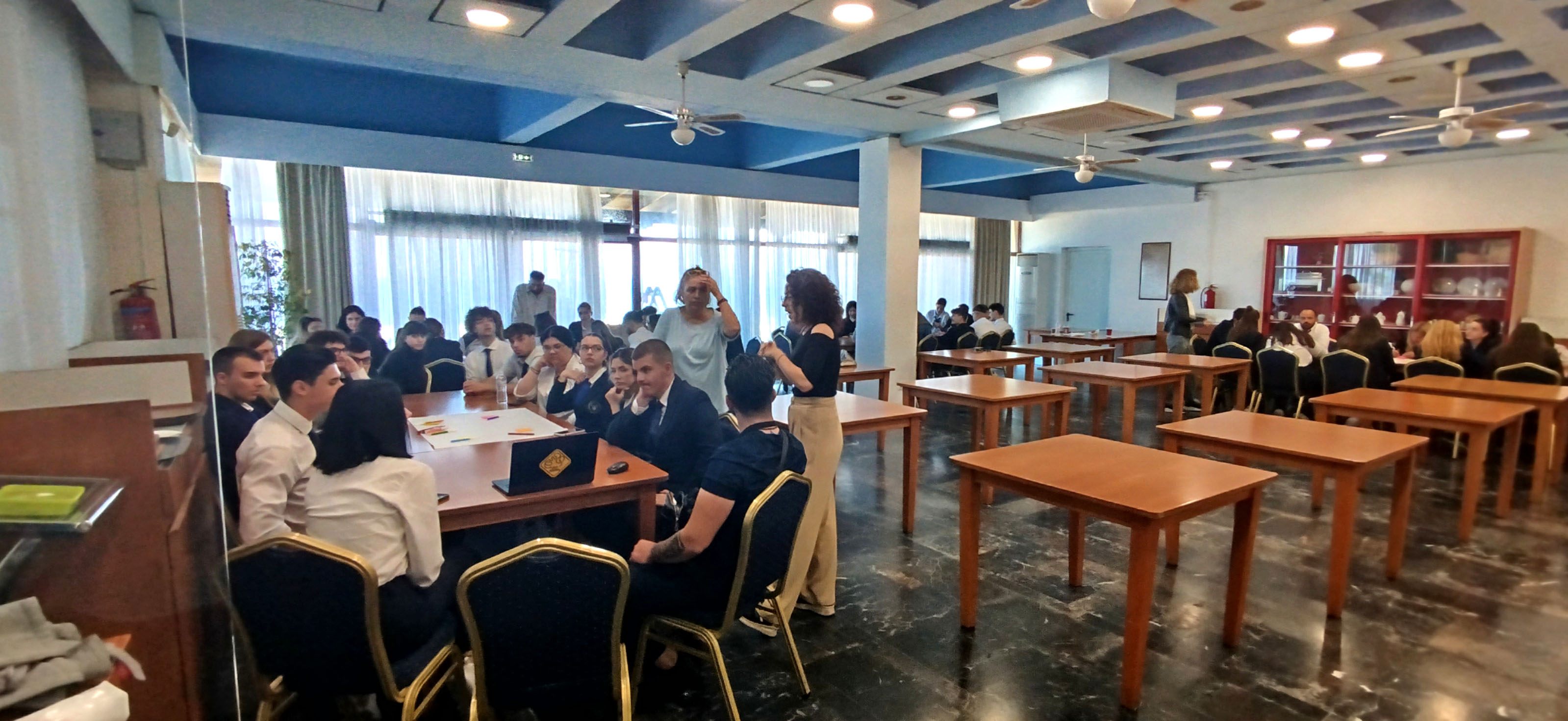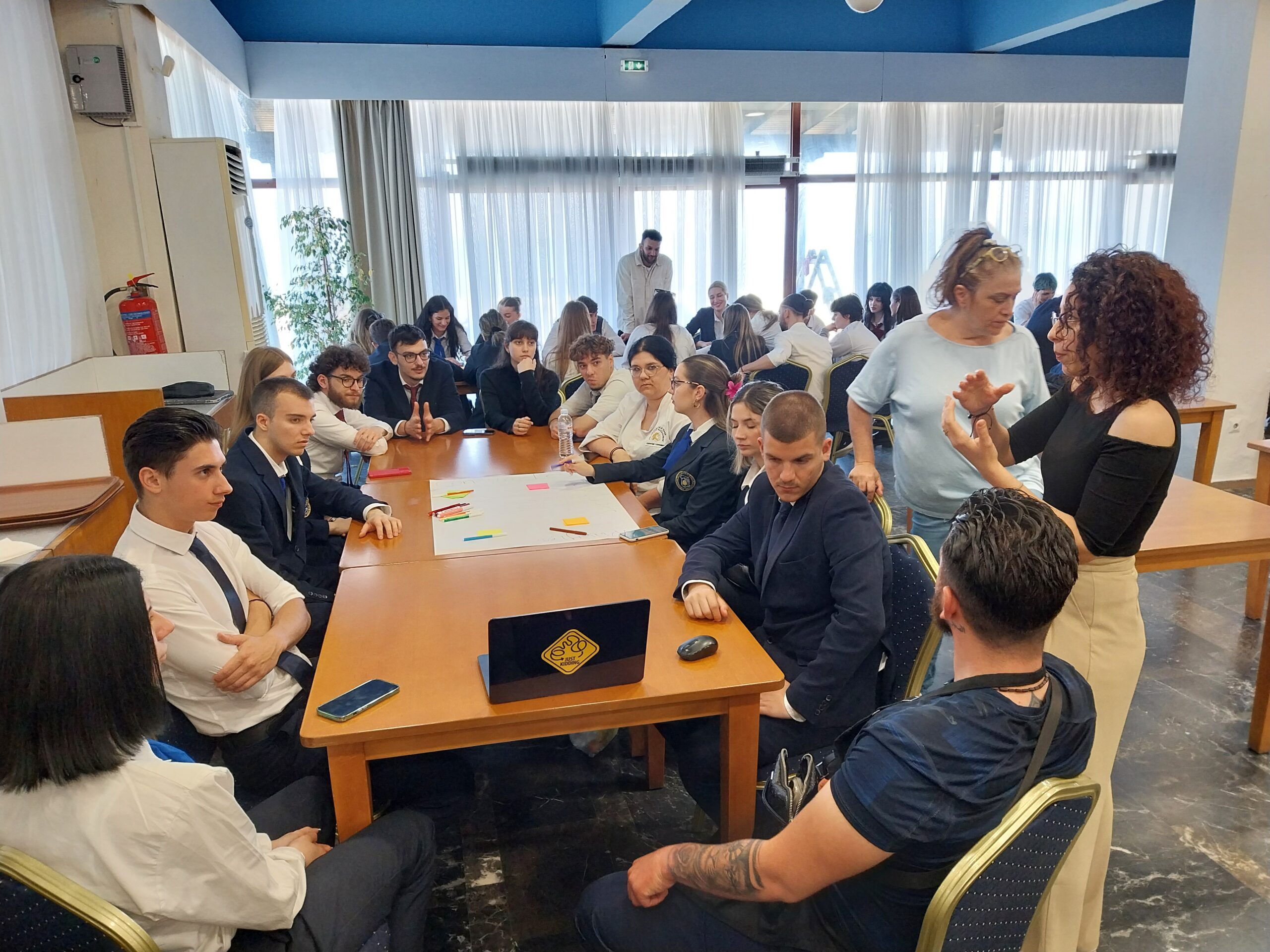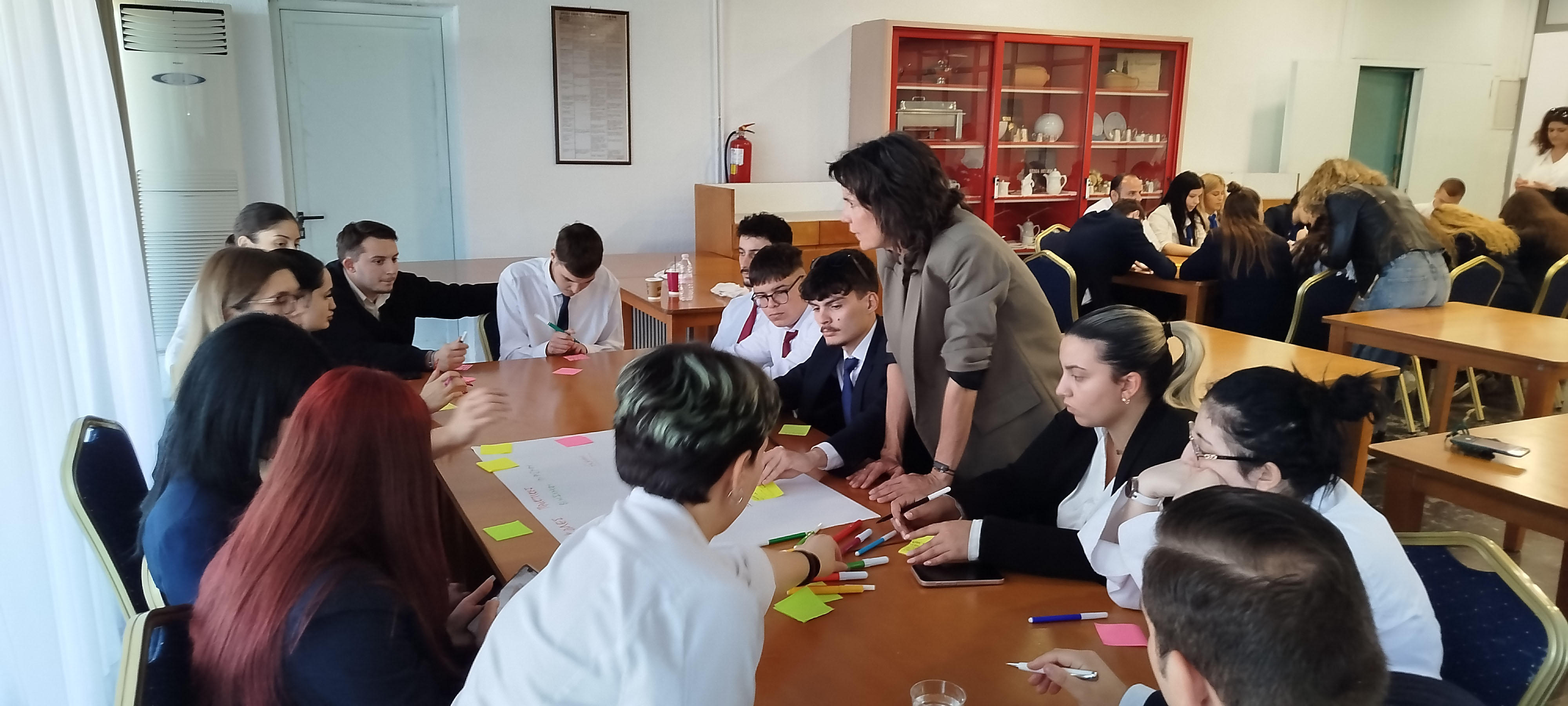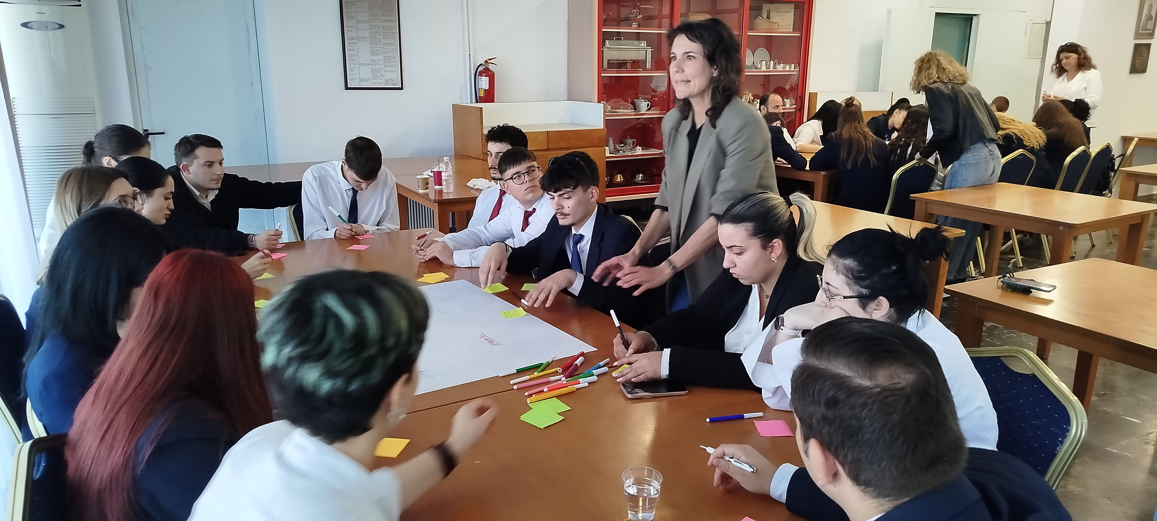 Ιδιαίτερο ενδιαφέρον προκάλεσε η παρουσίαση της εργασίας Think Green από τους σπουδαστές/ στριες της Πειραματικής ειδικότητας «Στέλεχος Επιχειρήσεων Φιλοξενίας με εξειδίκευση στον Τομέα ΔΙΟΙΚΗΣΗΣ δωματίων – Rooms Division Management» Μαρία Ελένη Καλεντέρογλου, Τρύφωνα Κιουτούτσκα και Δημήτρη Παρασκευόπουλο, οι οποίοι ανέδειξαν καλές πρακτικές βιωσιμότητας στις ξενοδοχειακές μονάδες.